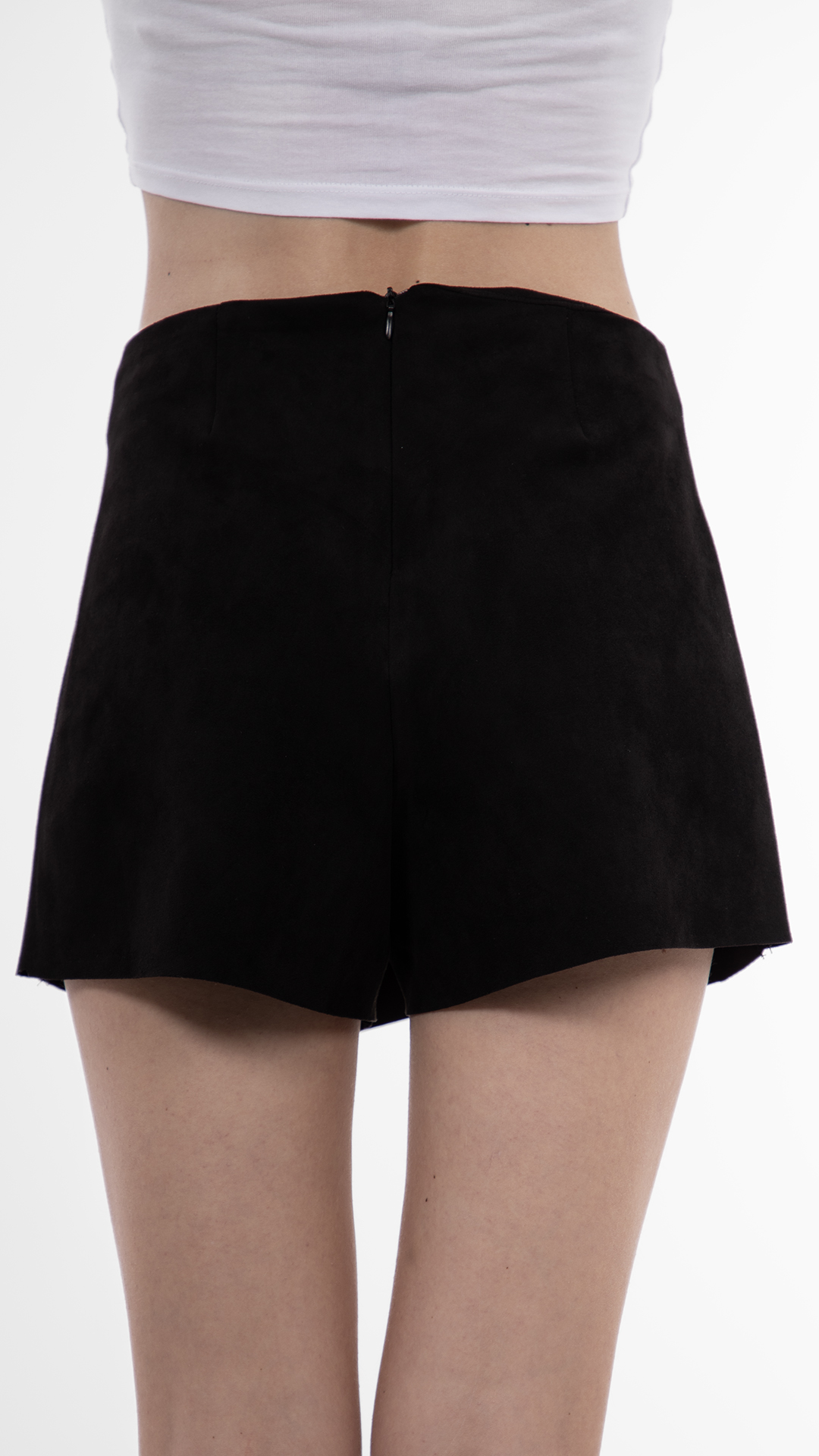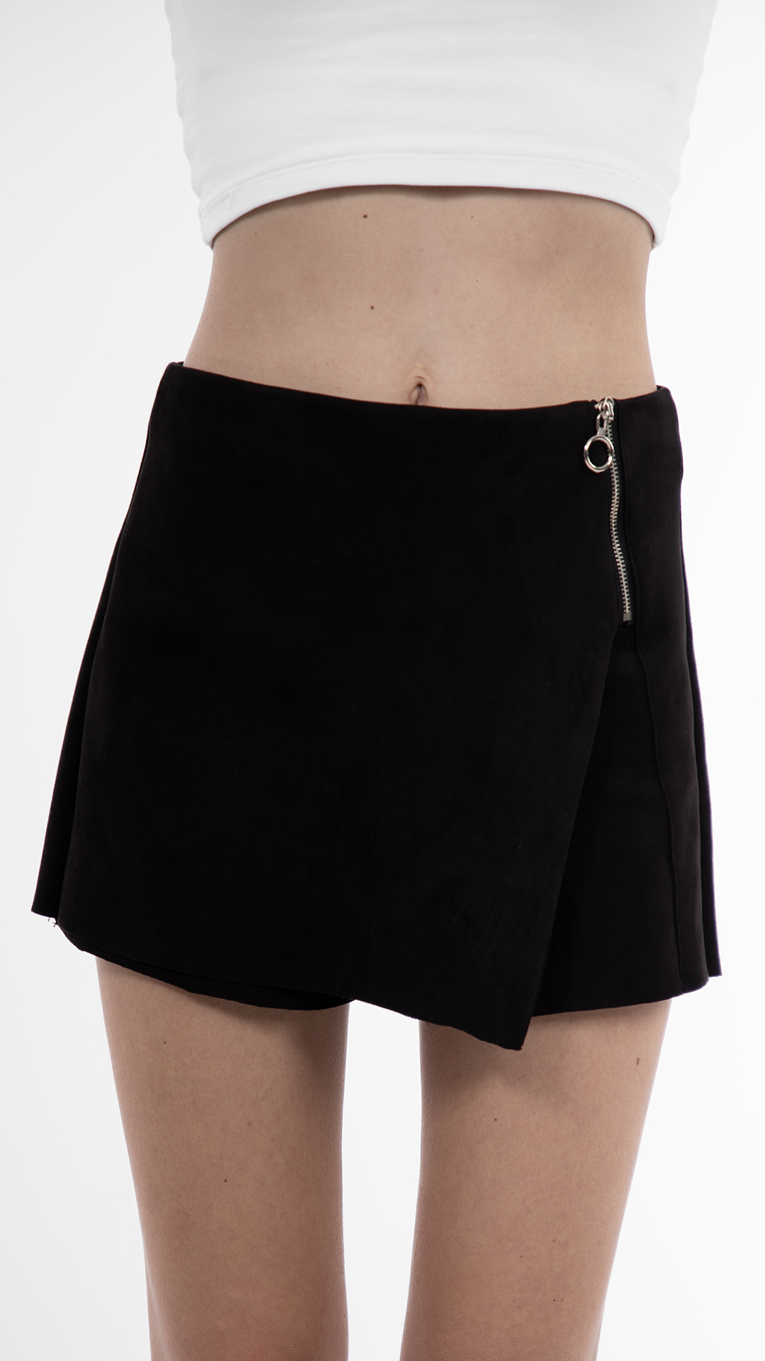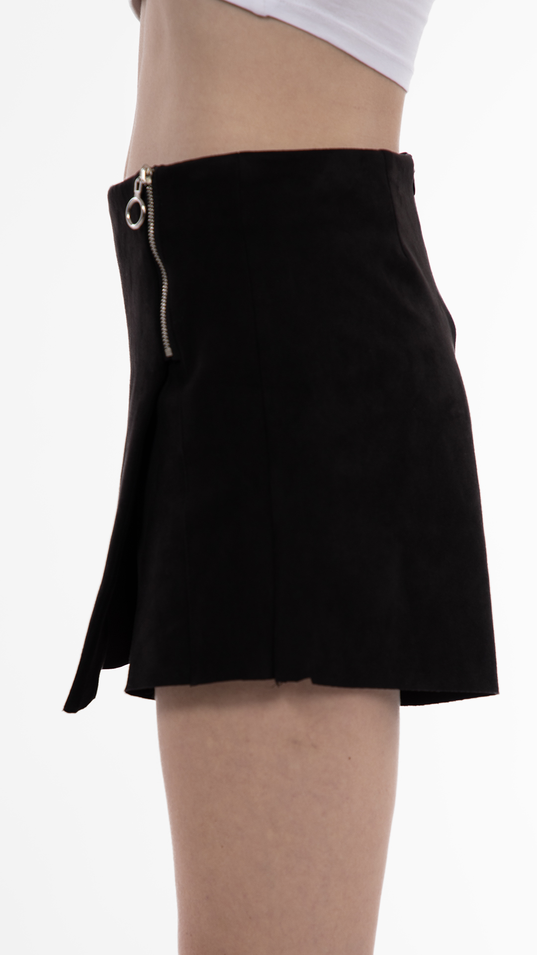This reimagined skort features a faux suede construction, back zipper closure and an asymmetrical hem.