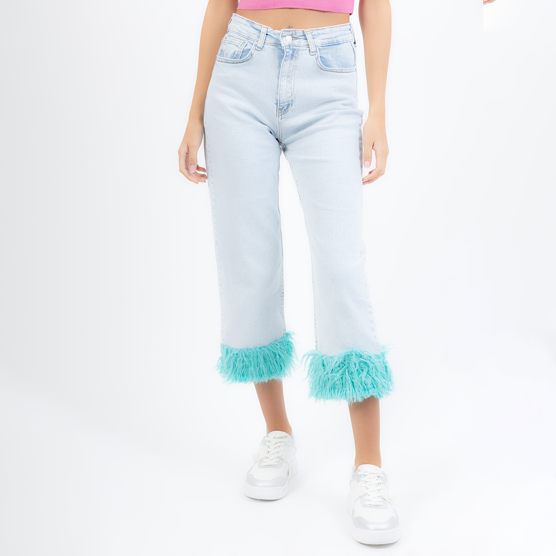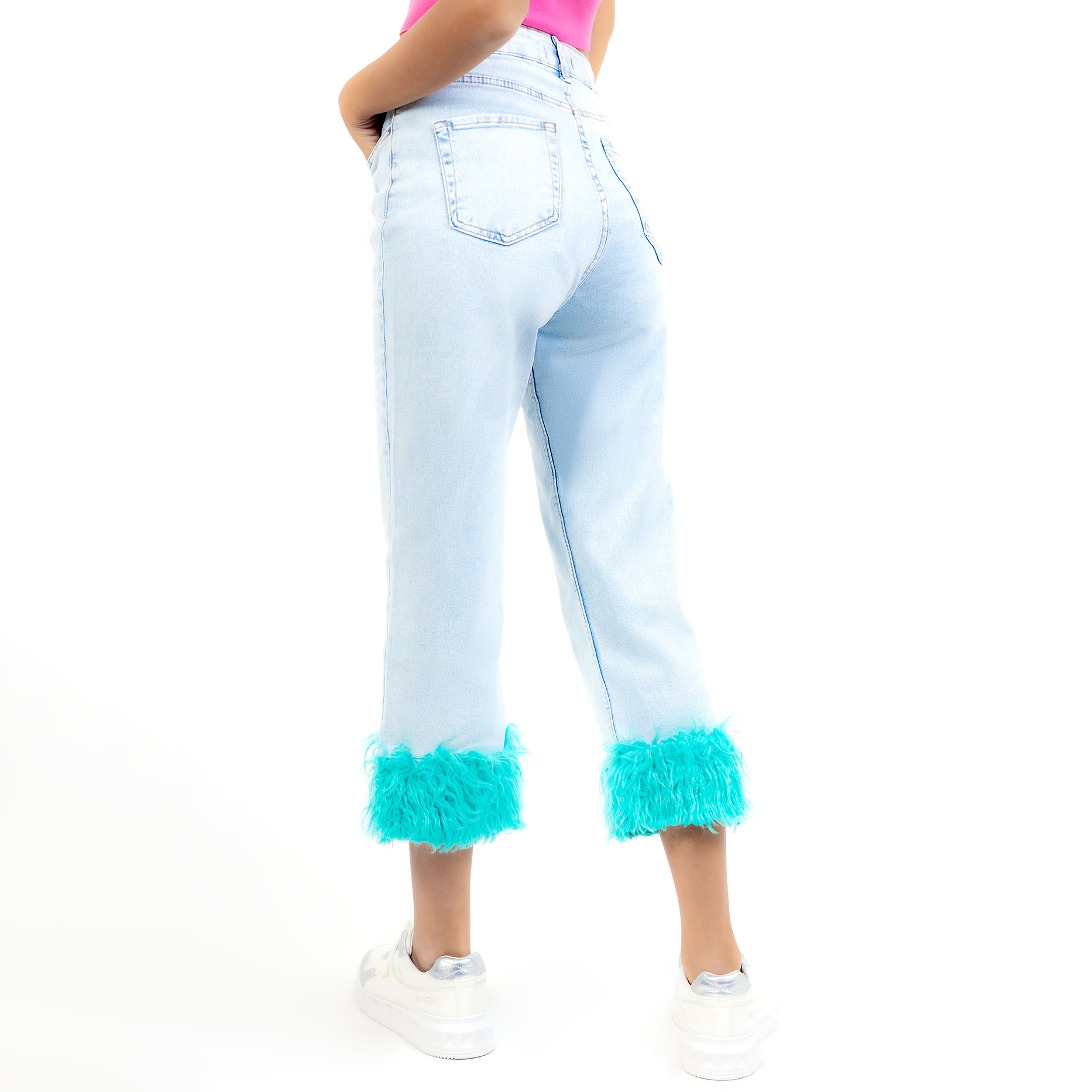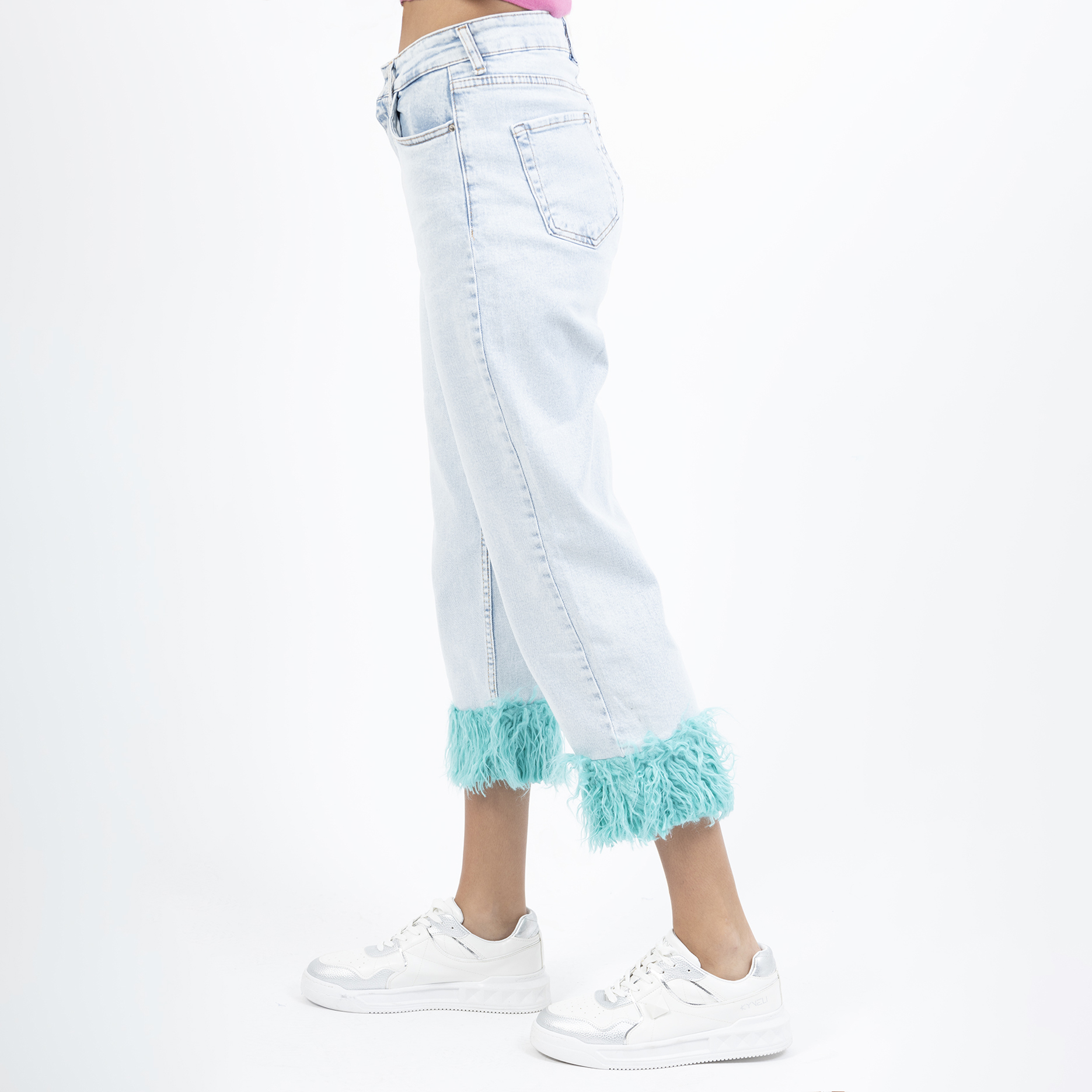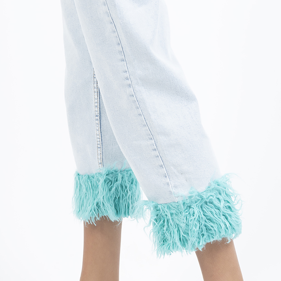 Feather trim high waisted straight leg jeans